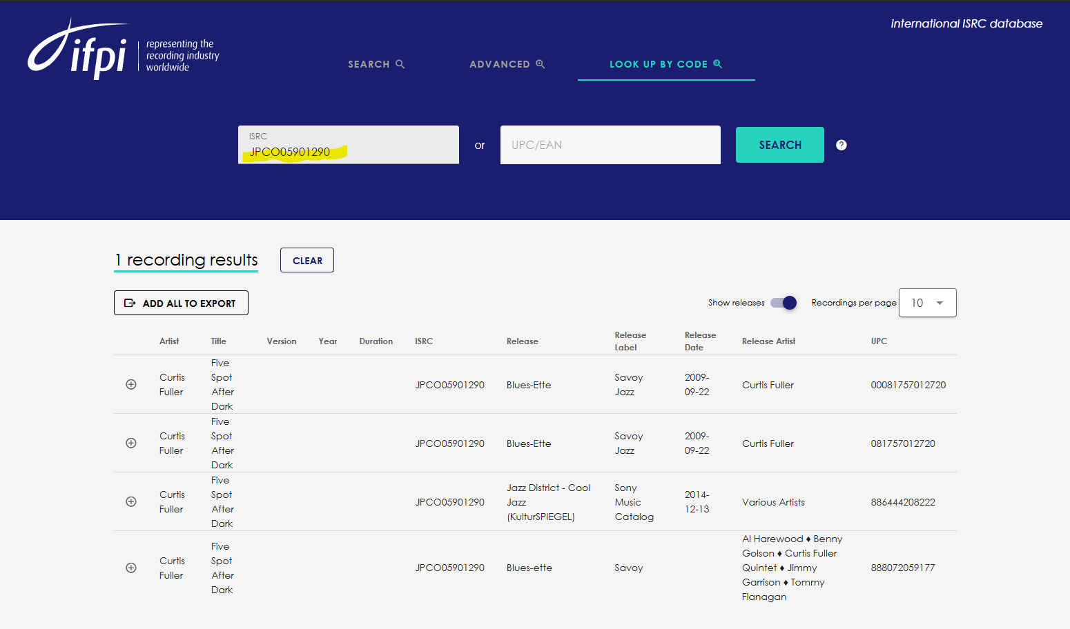 次のサイトなどで、ISRCコードから楽曲を検索できる(逆にアーティスト名や楽曲名からISRCコードの検索も)
